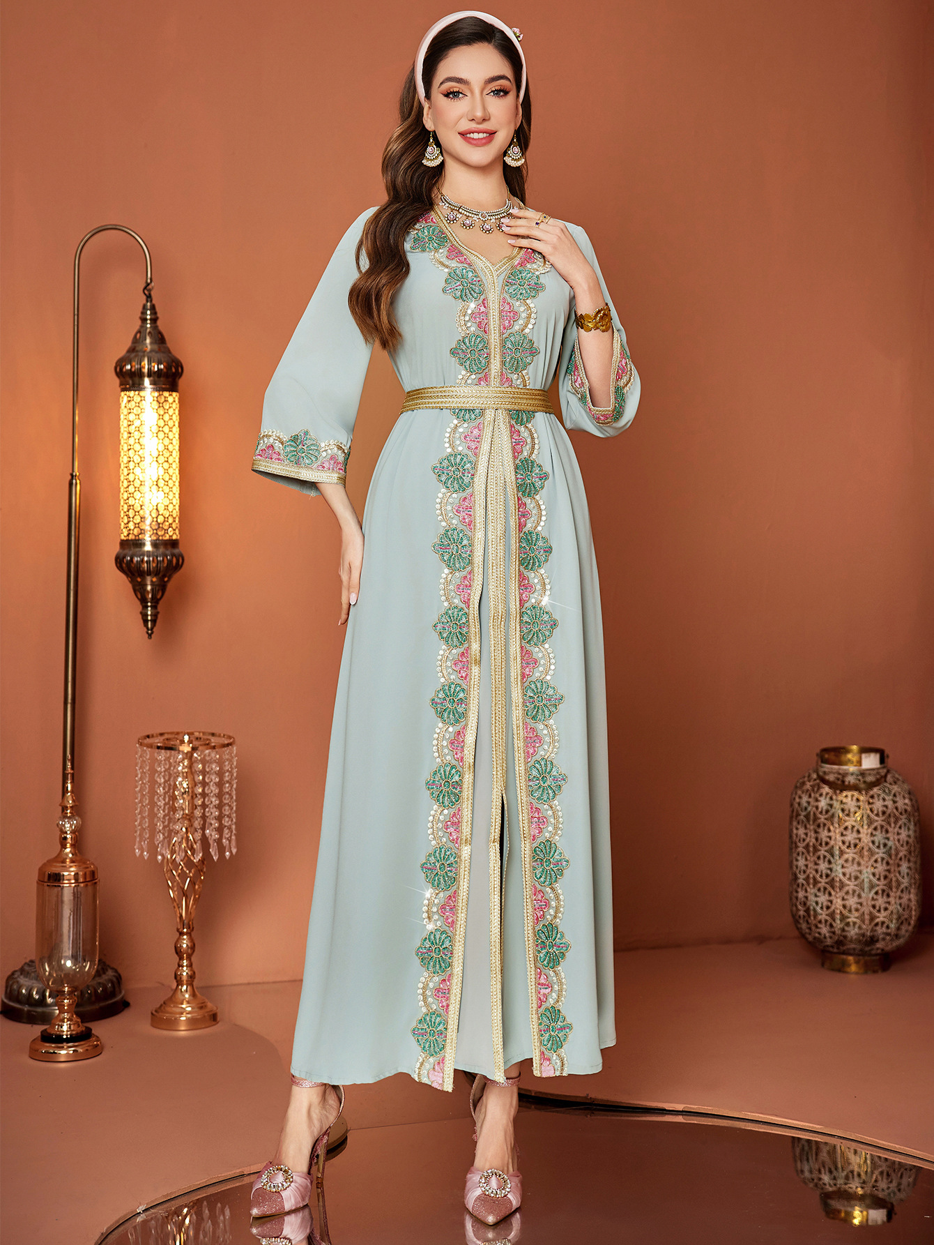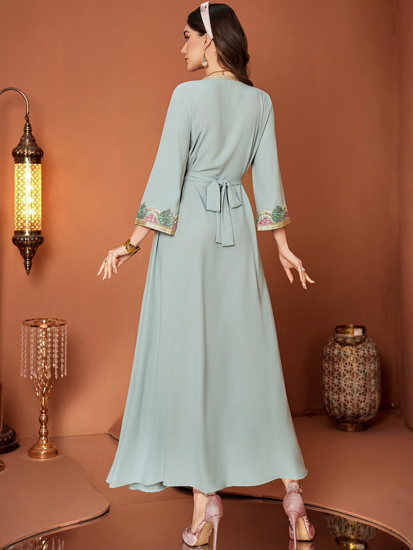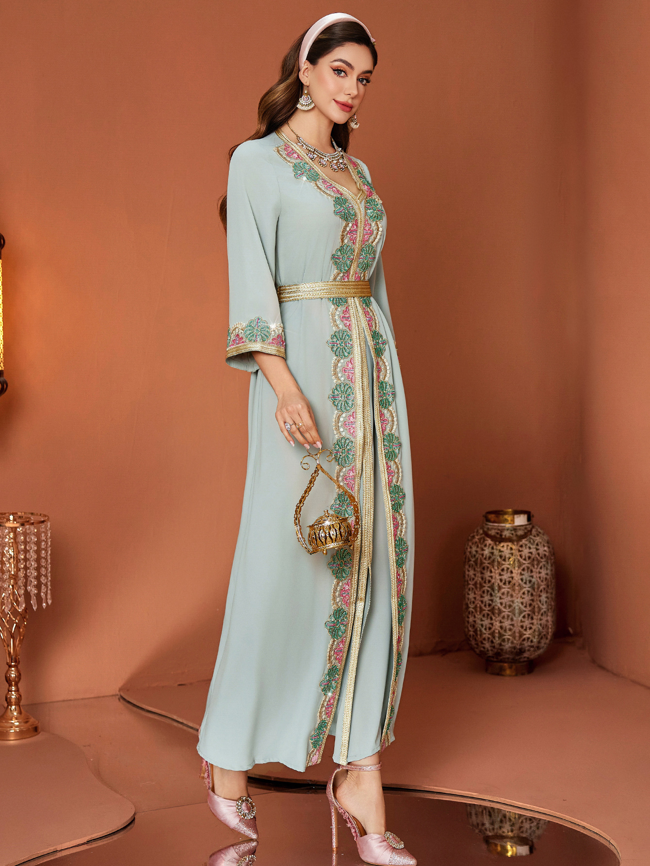 New Bean Green False Two-piece Patchwork Lace Embroidered Lace V-neck Dress for Arabian Women