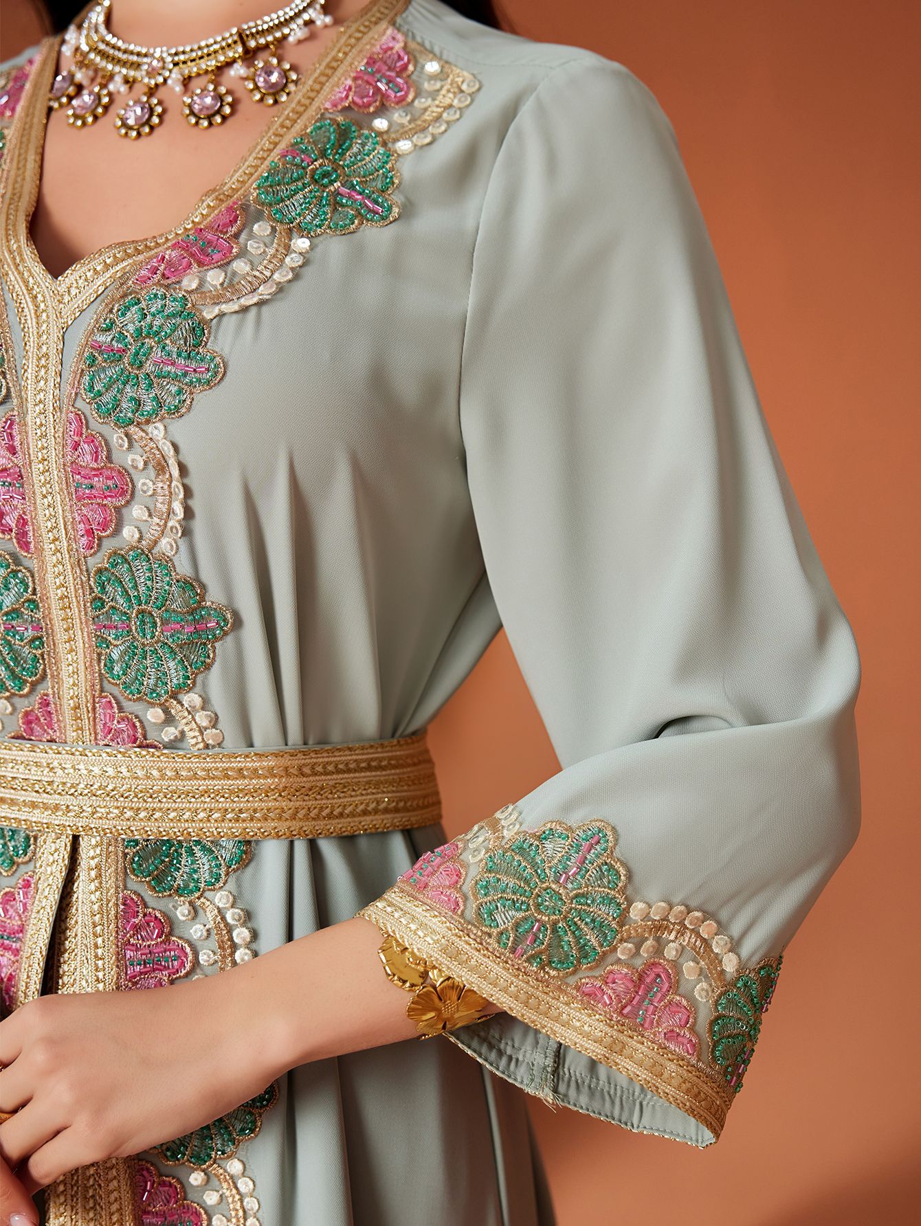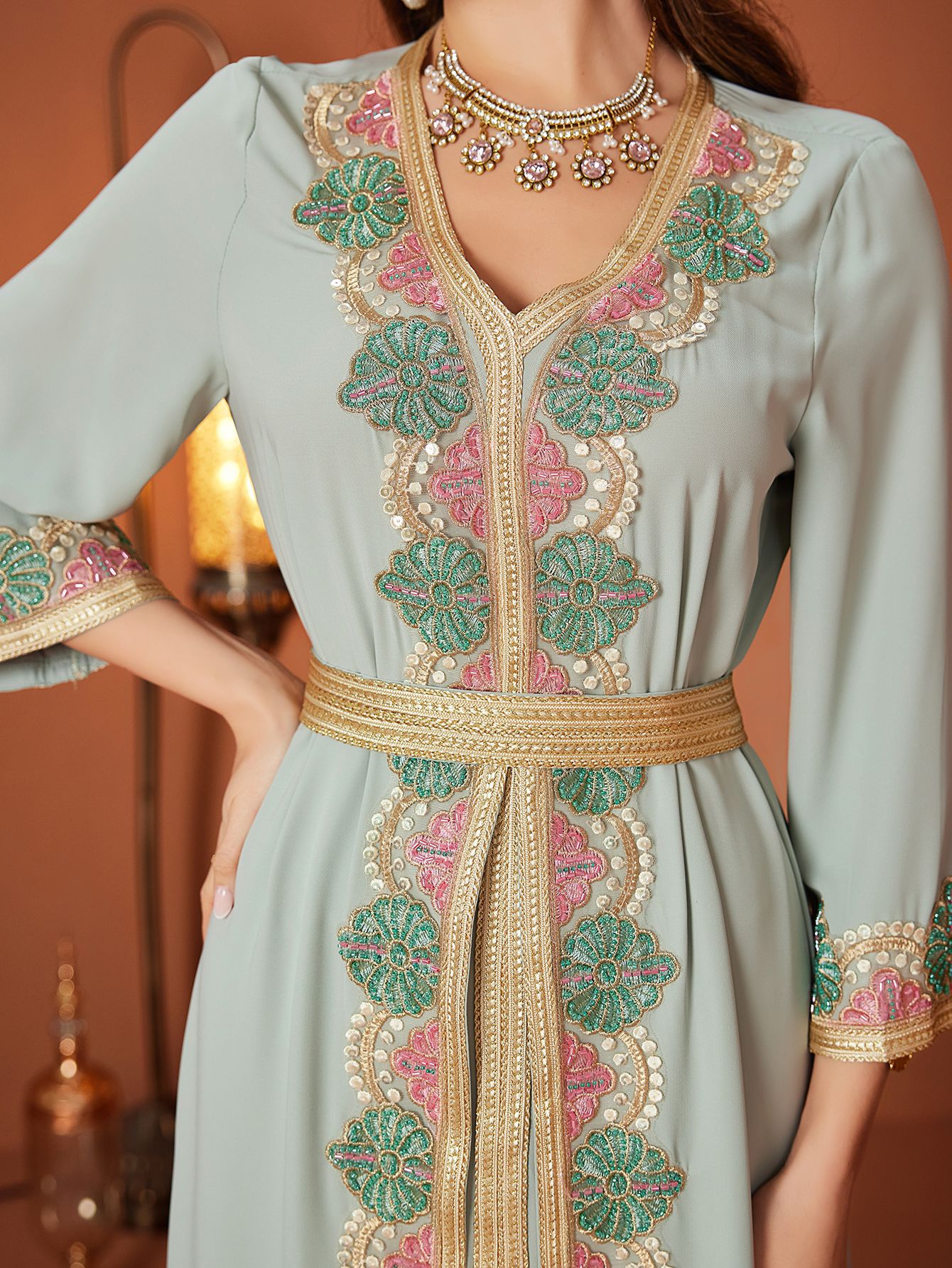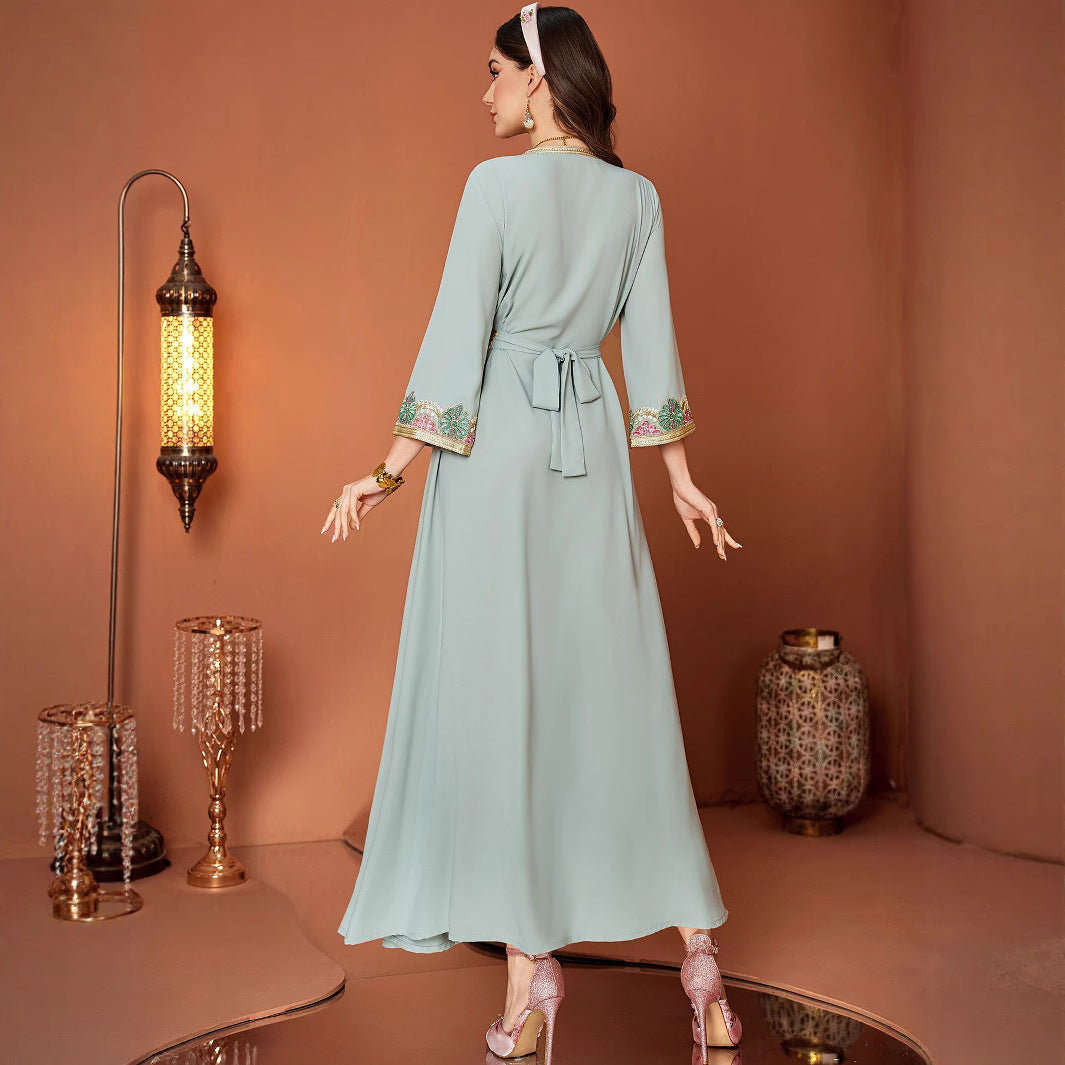 New Bean Green False Two-piece Patchwork Lace Embroidered Lace V-neck Dress for Arabian Women